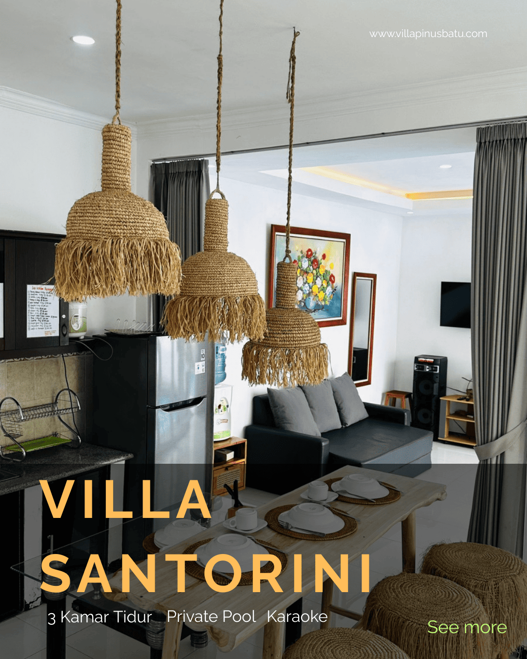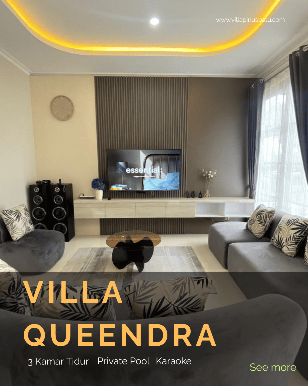 VIlla dengan 3 kamar tidur dengan fasilitas WIFI, karaoke, dan dapur cocok buat anda yang cari villa keluarga atau rombongan, dengan living room estetik dengan udara sejuk dan nyaman