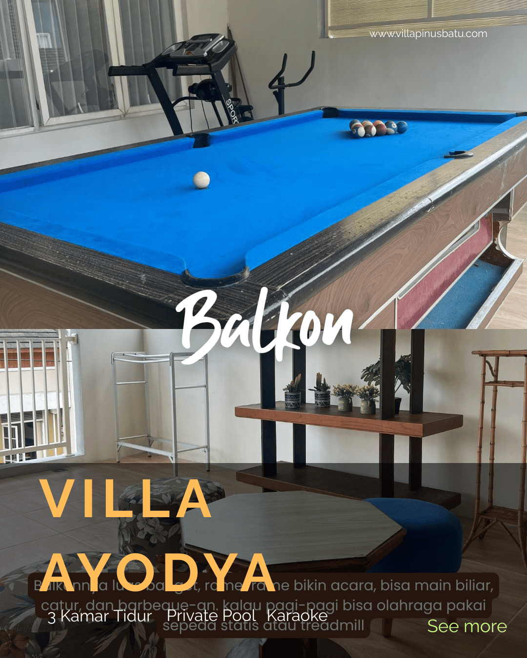 VIlla dengan 3 kamar tidur dengan fasilitas kolam renang, karaoke, BIlliard dan dapur cocok buat anda yang cari villa keluarga atau rombongan, dengan living room estetik dengan udara sejuk dan nyaman